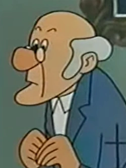 In the cartoon, Sakharine wears pale red jacket, white shirt, light brown necktie, black trousers and brown shoes.