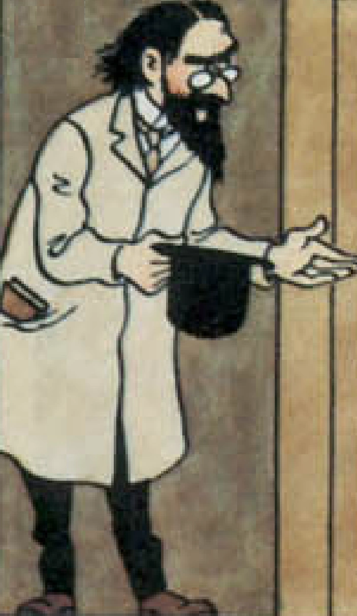 In the books, Ivan Ivanovitch Sakharine is a Russian Jew who is a collector of model ships, of which one among them is one of The Unicorn. After noticing another model of the Unicorn at a market, he and another man named Barnaby attempt to purchase it only to find that it has already been sold to Tintin. Tintin rejects all of the offers made by the two to buy the model from him. After Tintin's Unicorn is stolen he suspects Sakharine of the theft. Upon visiting Sakharine he discovers he has another Unicorn model. Sakharine is subsequently attacked by Barnaby who steals a hidden parchment from inside the second Unicorn model. Later on after the Bird Brothers are arrested, they claim that the parchments they owned, had likewise been stolen. Tintin suspects Sakharine of stealing the two parchments, but he soon discovers that it was in fact a third party and recovers them. At the end of Red Rackham's Treasure, Sakharine can be seen attending the exhibition held at Marlinspike Hall, showing off the various items recovered from the actual ship itself. Sakharine was to appear in the last Tintin story, Tintin and Alph-Art with some other characters from various prior stories, but due to Hergé's death, the story was left unfinished. He appears in the Yves Rodier version of the book. Tintin spots him at Akass' show.
