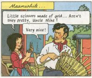 Miarka finds gold scissors and shows them to Mike.