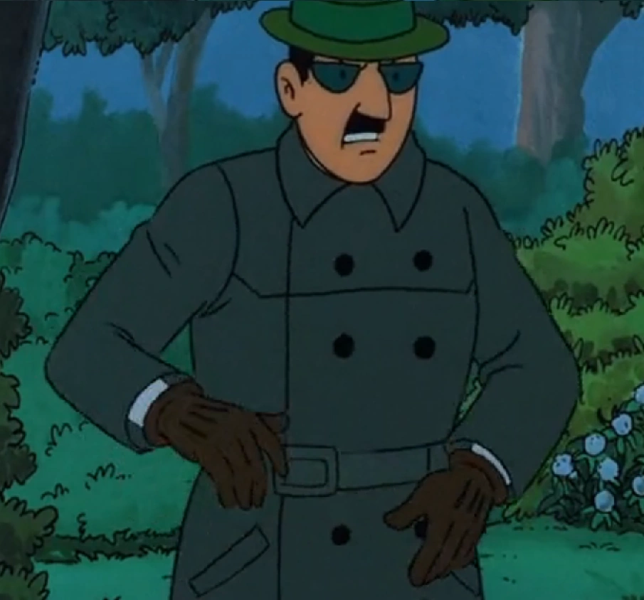 Szhrinkoff has dark-coloured hair, grows a small moustache, and wears the characteristic blue overalls and green fedora of a Bordurian spy. His name is undoubtedly a play on the English words "shrink off."