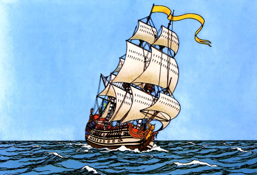 While browsing in a market in Brussels, Tintin buys an old model ship with which he intends to give to his friend Captain Haddock as a gift. Two strangers, a model ship collector Ivan Ivanovitch Sakharine and a mysterious figure known only as Barnaby, unsuccessfully try to convince Tintin to sell the model to them. Returning home with the model, Snowy knocks it over and its mainmast broke. Repairing it, and showing the ship to Haddock, the latter is amazed that it is actually a model of the The Unicorn, a 17th-century warship captained by his ancestor, Sir Francis Haddock. Later the model ship is stolen, and it is revealed that Sakharine owns an identical model of the Unicorn, although this is also stolen as well. Returning home, Tintin discovers a rolled-up parchment hidden under furniture, on which is a part of a riddle that points to the location of treasure, and he realises that this must have been hidden in the mast that Snowy broke.
