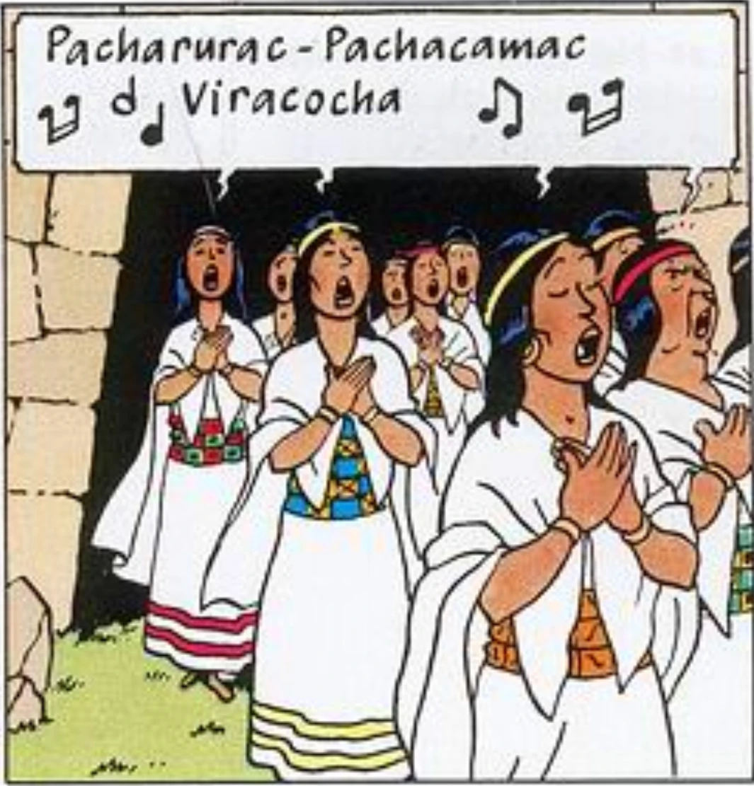 The Virgins of the Sun are a group of Inca women who appear in the book "Prisoners of the Sun". They first appear wearing white dresses with various colored sashes, headbands, and dress trimmings, and singing to the gods during the time of Tintin, Captain Haddock, and Professor Calculus's sacrifice to the sun god, Pachacamac, as per punishment by the Prince of Sun for violating the sacred temple and wearing the sacred bracelet of Rascar Capac, respectively. But when the eclipse, under the guise of Tintin controlling the sun, occurs, they- along with the other Incas-run in terror as they believe that the sun god was angry with them for such "undesired" sacrifices.